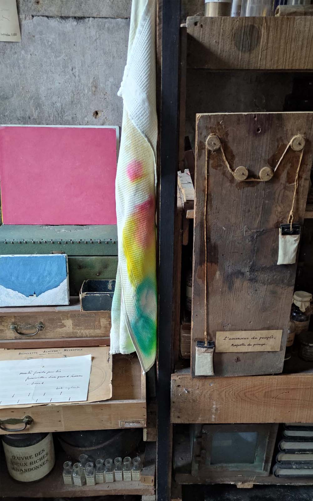 On peut également y admirer la maquette d’une invention d’Alphonse Allais «l’ascenseur du pauvre» appareil destiné aux petites gens habitant les étages supérieurs des beaux immeubles haussmanniens. Il aurait permis à monsieur, rentrant harassé (ou imbibé d’absinthe) d’être hissé au 6ème étage de son immeuble par le mouvement contraire de son épouse, lestée d’un objet suffisamment lourd pour faire plus que contrepoids. Il ne restait plus alors à madame qu’à remonter à pied les 6 étages, les bras encombrés dudit contrepoids!