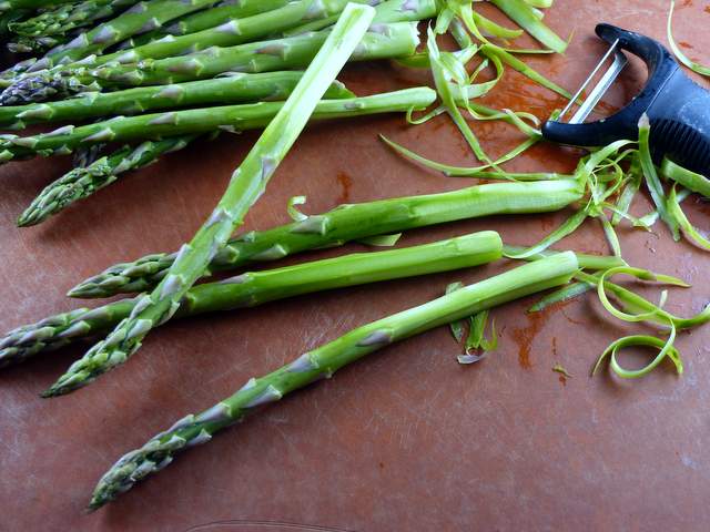 asparagus off at the place where they break easily. (You can use the trimmings in a vegetable broth.) If desired, peel the bottom half of