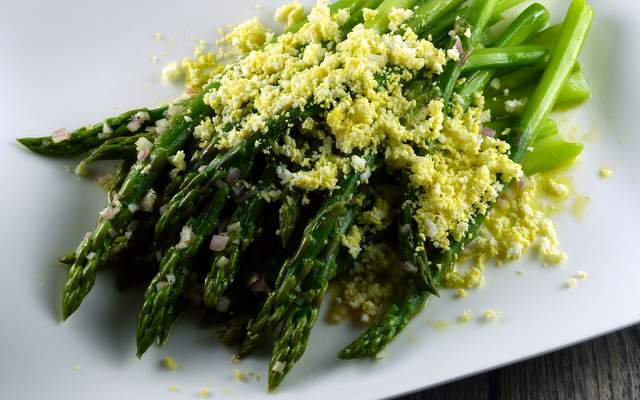 One tradition I enjoy during the fair-weather months is farmers’ market lunches. In the late spring and early summer, these meals will typically feature an asparagus salad like this one. When you see the word mimosa in the recipe title, you might think of the popular champagne and citrus cocktail. However, in this case, mimosa refers to the garnish of sieved hard-boiled egg, which resembles the golden yellow flowers of the mimosa plant that brighten the countryside of the South of France in late winter and early spring.