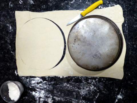 floured rolling pin, roll the dough into a 12-by-19 1/2-inch rectangle. Using a 9 1/2-inch cake pan or bowl as a guide, cut out two circles