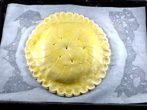 3. Brush the top of the galette with the egg wash, taking care not to let the egg wash drip down the sides as this might prevent the pastry from rising properly. Working from the center, score the top in a petal design. Do not cut through the pastry. Poke a few holes in the top to allow the steam to escape. Cover the galette and refrigerate for 30 minutes.