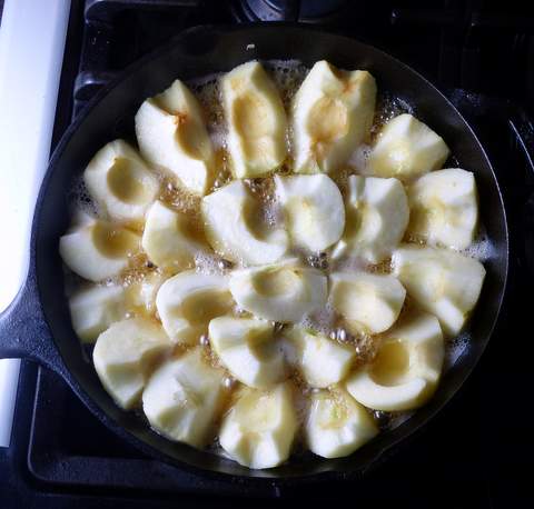 sides of a 10-inch ovenproof skillet. Pour in maple syrup, and tilt to coat bottom evenly. Arrange apples snugly (right), rounded