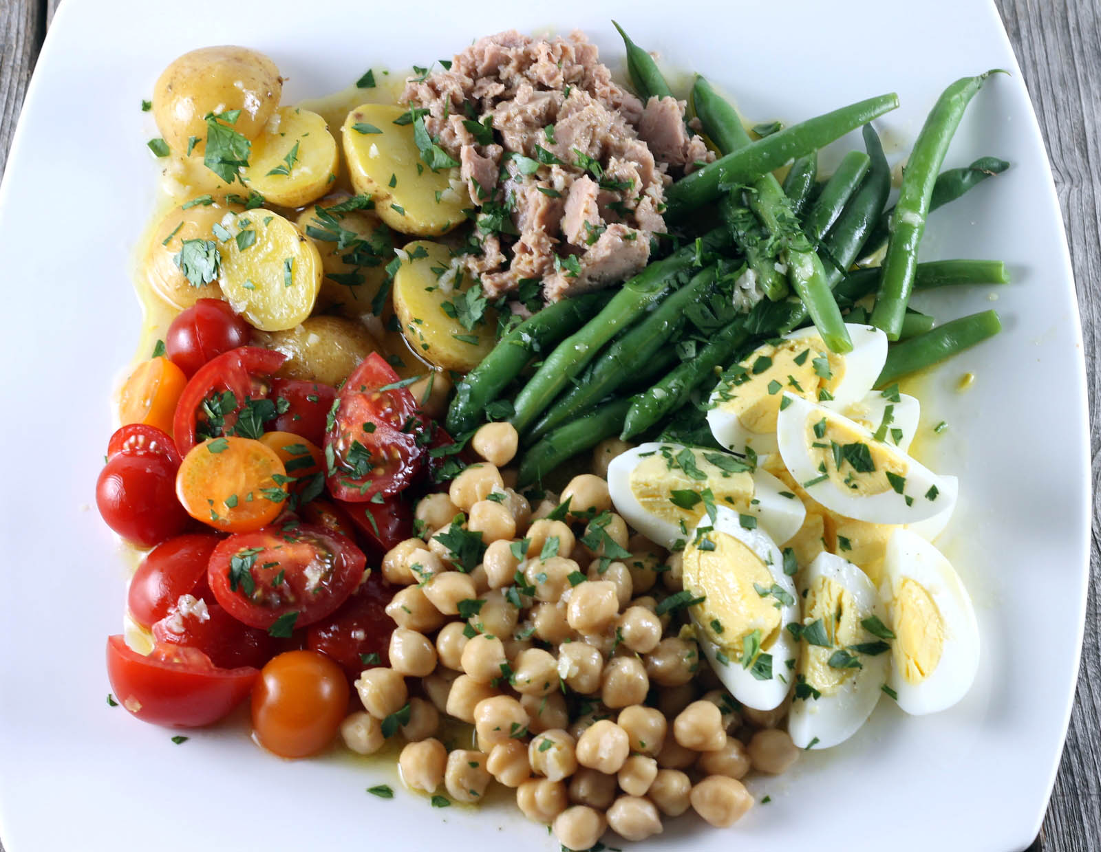 4. Arrange the potatoes, green beans, chickpeas, tomatoes, tuna, and eggs on serving platter (or 2 plates). Drizzle some of the remaining vinaigrette over the salad. (You may have some vinaigrette left over.) Garnish with parsley, if desired.