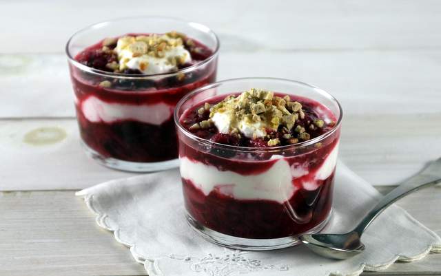 Although this recipe is not traditional in French cuisine, the concept of verrine is popular in France these days. Verrines are attractive and easy to prepare. Get out some glasses and start layering! Rhubarb and blackberries are perfect for early summer, but feel free to improvise with summer fruits as the season progresses.