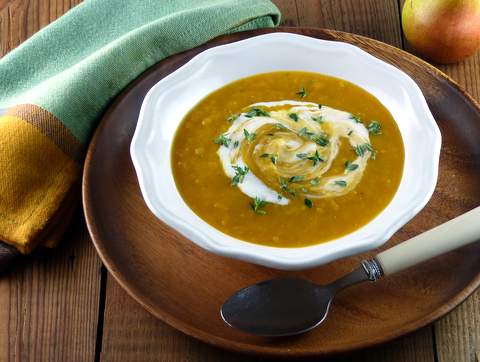 Seasonal fresh pears and pear juice contribute subtle sweetness to this soup, while thyme lends a delicate earthy flavor. A dollop of crème fraîche, swirled into each bowl, brings all the flavors together.