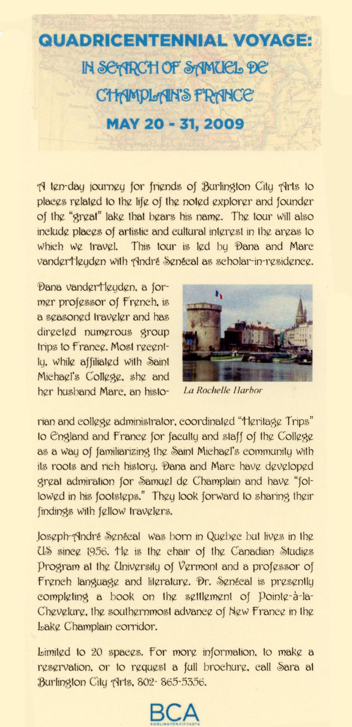“We came back said to Doreen that we could work out a trip,” Dana recalled. When they proposed the voyage to the office of Mayor Bob Kiss, he was supportive, and Burlington City Arts would sponsor it. François Gauthier, France’s consul-general to New England, helped connect the organizers to relevant places. The eleven-day journey would be called “In Search of Samuel de Champlain’s France” and would depart on May 20, 2009.